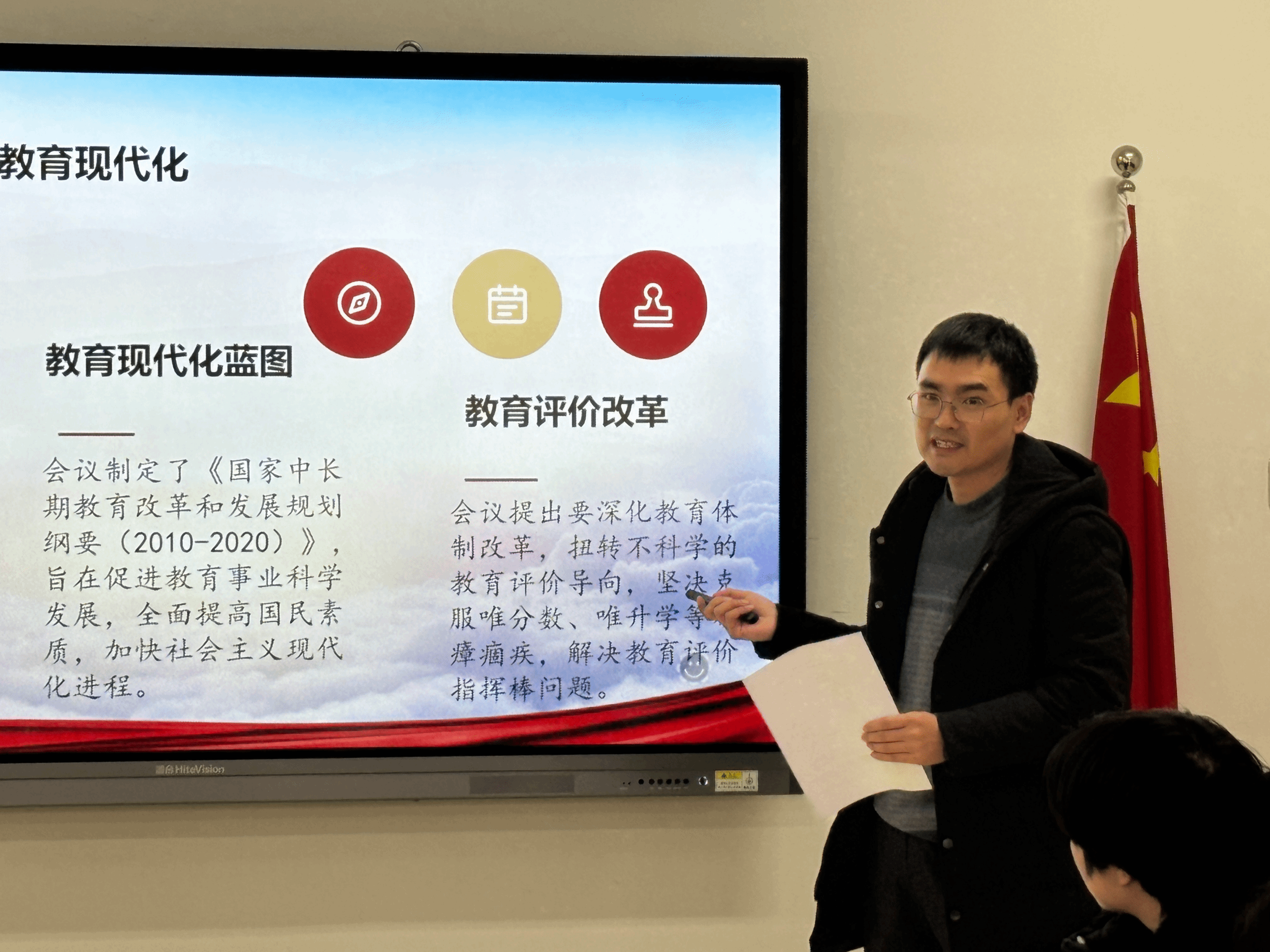 为深入学习贯彻全国教育大会精神,提升支部党员理论素养,2024年12月13日下午,教育科学学院党委委员、副院长韩建涛于田楼B座308会议室为心理学本科生党支部讲授“学习全国教育大会精神,助力学校三大振兴行动计划”主题党课。党支部书记张理强、支部副书记金凤仙,以及全体学生党员参与会议,会议由张理强主持。