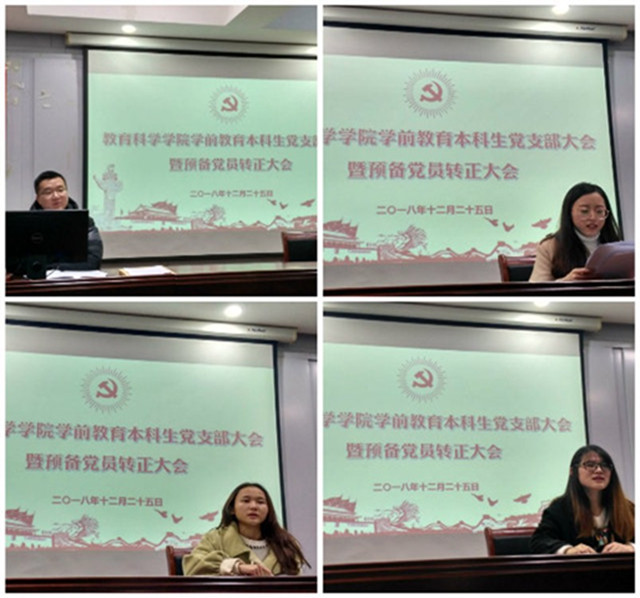 本网讯(教科院曹玲玲 龚伟)四十年风雨兼程,四十年风华正茂。12月25日上午10:00学前教育本科生党支部举行了庆祝改革开放40周年学习交流会暨预备党员转正大会。大会由支部书记龚伟主持。