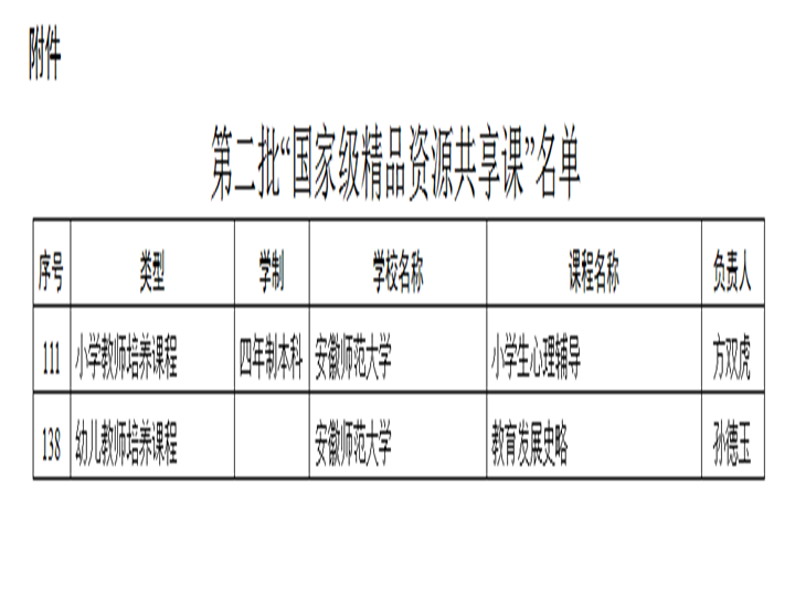 我院一直以来高度重视教学课程资源建设,加强信息化教学改革。2017年,教育部办公厅下发《教育部办公厅关于公布第二批“国家级精品资源共享课”名单的通知》(教师厅函〔2017〕3号),我院孙德玉教授主持的《教育发展史略》和方双虎教授主持的《小学生心理辅导》2门课程入选,并成功上线“爱课程网”。这是我院继第一批2门课程入选后的再次获批“国家级精品资源共享课”荣誉称号。