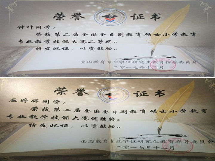 近年来,学院高度重视教师教育类专业学生职前培养,特别是师范类专业学生从教技能训练,学生在全国、全省师范生技能大赛中取得优异佳绩。2016级教育硕士小学教育专业研究生钟叶、庄婷婷同学分获第二届全国全日制教育硕士小学教育专业教学技能大赛二等奖和优胜奖。2015级学前教育专业本科生许佳绿和彭溪婷同学分别斩获安徽省第八届高等学校师范生教学技能竞赛学前教育本科组一等奖与二等奖。
