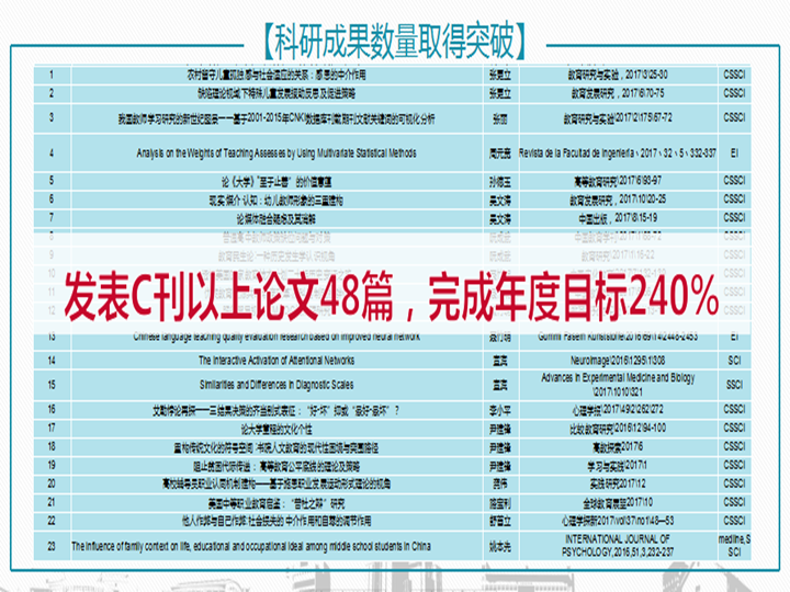 近年来,我院教师科学研究水平不断提高,国际化程度迅速提升,参与国际研究能力也得到长足发展。2017年,我院年度共发表CSSCI以上级别论文48篇,取得历史性突破,较2016年同比增长150%。其中,SSCI、SCI、EI论文12篇,一级学科权威期刊(三类)论文4篇,二级学科权威期刊(四类)论文12篇,二级学科权威期刊(五类)论文5篇。