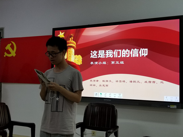 随后的第四组同学则是以语言类节目的方式通过朗读以及叙述心得表达自己一年来的心得体会。第五组同学则是通过表演中国共产党发展的历史片段表达了加入共产党的坚定信仰。