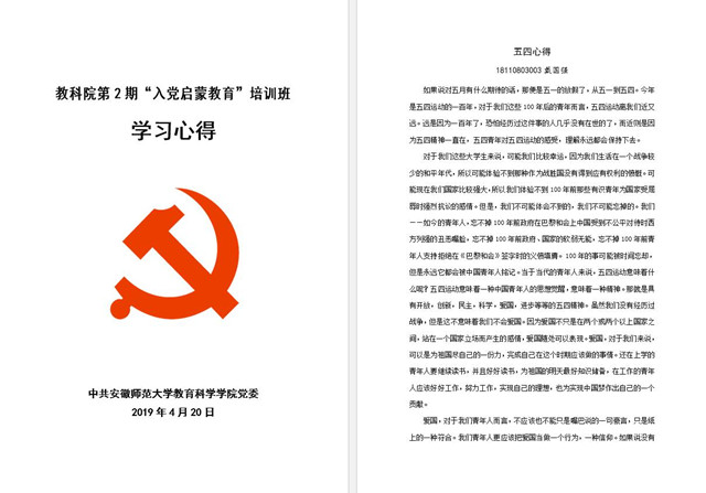 四个月前的3月28日,教科院第二期“入党启蒙教育”培训班第二学期的活动正式拉开序幕。在这四个月的时间里,学员们每两周进行一次活动,并通过学习心得、笔记、上课发言、驻班党员反馈等各种方式进行日常考核。通过驻班党员制度,5名驻班党员和17级的入党积极分子分别带领本组同学进行学习,通过谈话会,关心同学们的学习、生活等各个方面的内容,并且每两周开展一次教育考察会,及时了解本组成员的思想动态。通过这样一种“以老带新”的方式,不仅提高了同学们的学习效率,也减轻了同学们的学习压力。在“理论1+1”培训课堂中,启蒙班结合时政,开展了“聚焦全国两会,绽放青春光彩”“青春五四,传承百年”“红色之旅,铭记英烈”等多场学习分享会。与此同时为认识经典、解读经典、贯彻经典,启蒙班还连续开展了4期《共产党宣言》的学习活动。