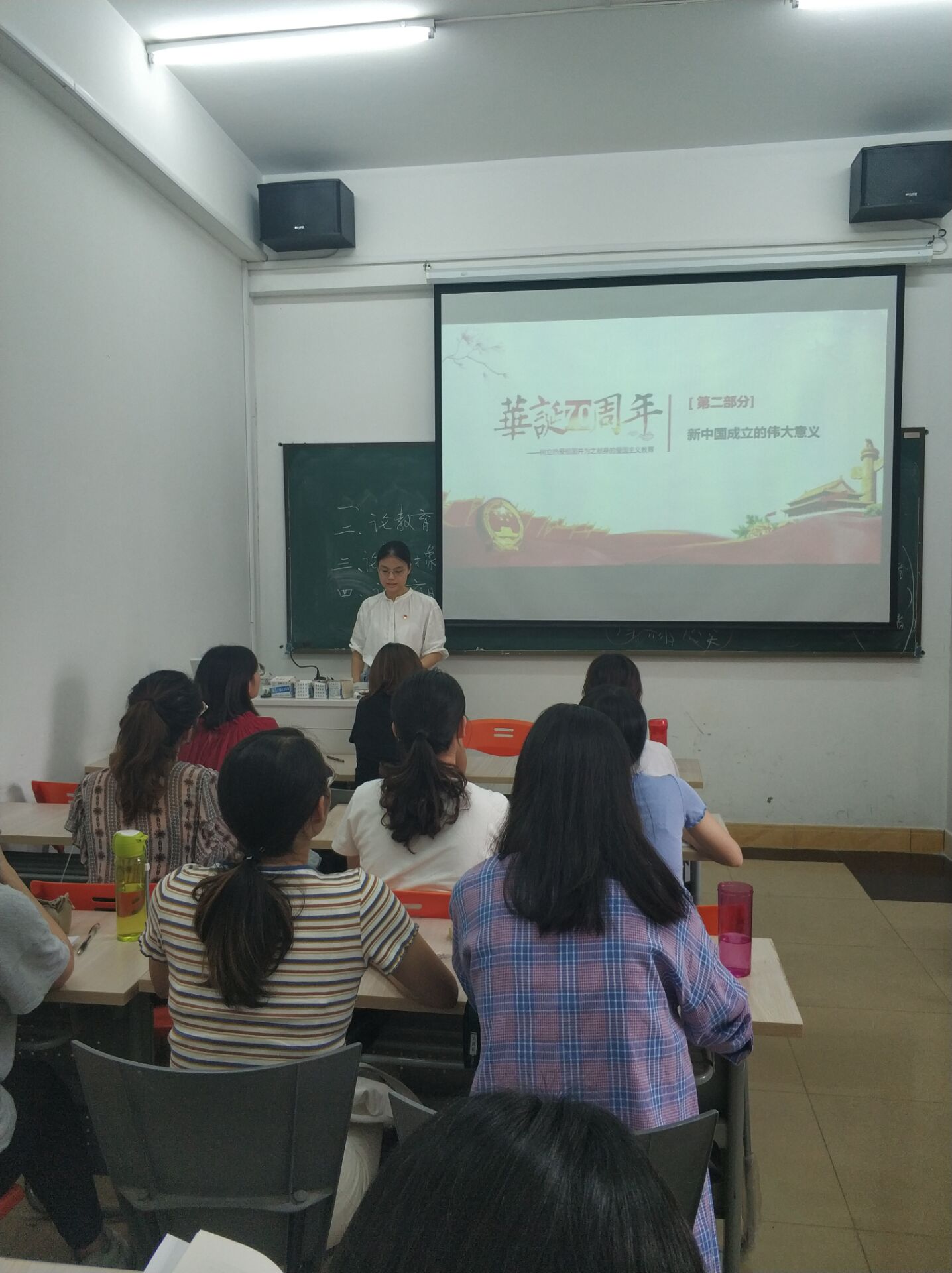 本网讯(陈玉莲)在这个金桂飘香、秋高气爽的美好时节,我们迎来了伟大的新中国70华诞。为庆祝新中国成立70周年,9月29日中午教育硕士研究生党支部全体党员齐聚学院研三教室,党支部书记张慧组织大家开展主题党日活动为祖国庆生。