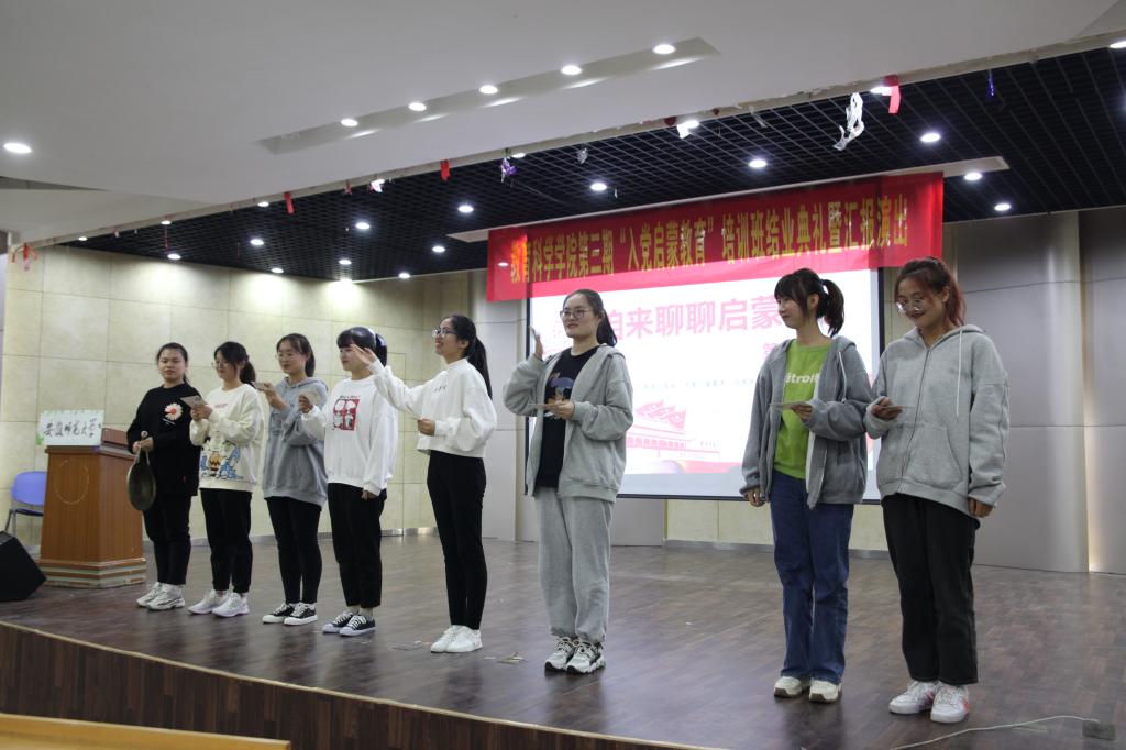 首先,在场所有人跟随视频一起回顾了第三期学员的启蒙班生活,视频里不断出现理论课学习、考察会和志愿服务等令人难忘的属于启蒙班的回忆。随后,五个大组依次进行汇报演出,第一组的节目是《三句半——咱来聊聊启蒙班》,每个人用简短的话语以及诙谐的语气与大家分享了她们多姿多彩的启蒙班生活;第二组《我和启蒙班的日子》,从几人制作的简短小视频和分享的感悟里可以看出她们的成长,从刚进启蒙班的青涩到后来的游刃有余,最后到结业和汇报演出的稳重;第三组的情景剧《玉汝于成》是关于爱、关于感恩、关于成长的蜕变,在几位同学生动的演绎下展现了当代大学生自强不息、心怀感恩的成长历程;第四组的诗朗诵《我的祖国》以及第五组的手语表演《国家》,都展现了“家是最小国,国是千万家”的家国情怀,是每个人加入启蒙班的初心和为之奋斗的使命。