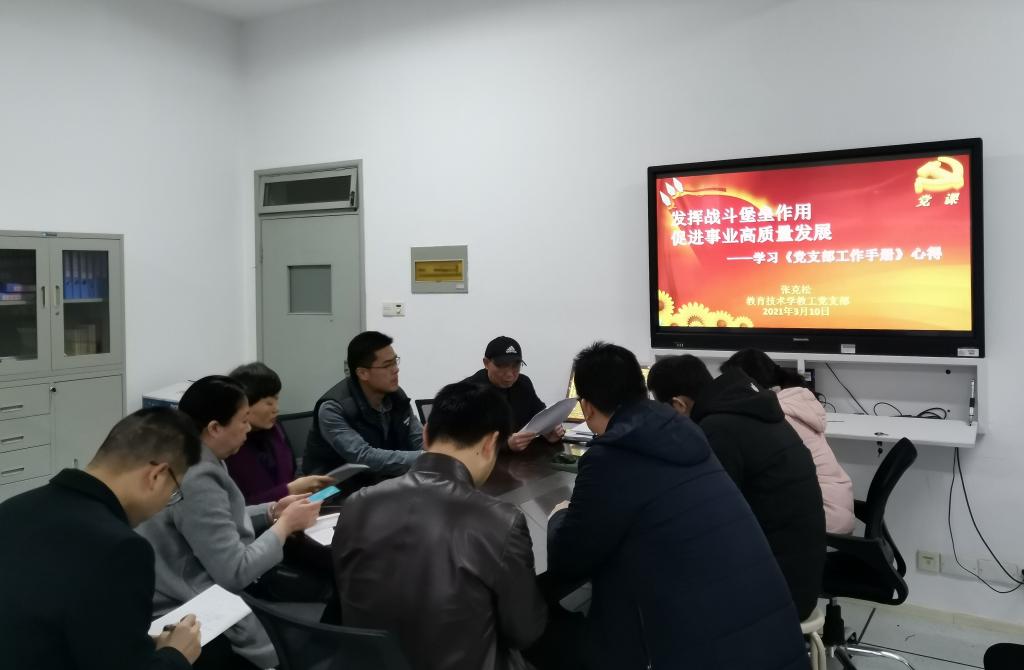 本网讯(教育科学学院  陶佳)2021年3月10日下午,教育技术学教工党支部在专业工作室(512室)开展包括支部党员大会、主题党日学习活动、支部书记上党课在内的系列支部活动,活动由支部书记张克松主持,副院长何海燕列席,支部全体党员教师出席。