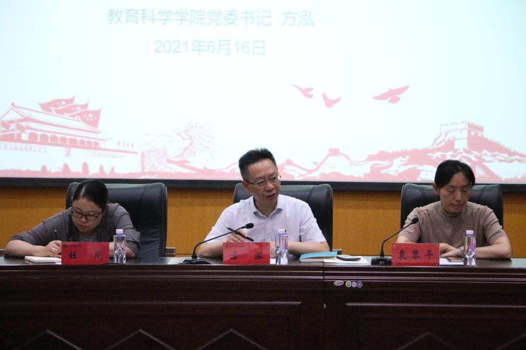 本网讯(教科院 曾可伊)为致敬中国共产党成立100周年,提升学生党员的党性修养,2021年6月16日下午,教育科学学院于田家炳教育书院三楼报告厅开展学生党员交流会。院党委书记方泓、党委副书记杜凤、党委秘书袁黎平、心理学本科生党支部书记、2017级辅导员谭茹轩、全体毕业班党员以及2021年上半年新发展党员参与了本次会议。学前教育本科生党支部书记、2020级辅导员蔡文主持交流会。
