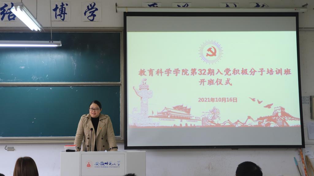 (本网讯 张天乐)为提升入党积极分子的政治理论水平,强化基本素养,把好党员“入口关”,确保党员发展质量,10月16日上午,教育科学学院第32期(校第62期)入党积极分子培训班开业典礼在田楼8101教室举行。院党委副书记杜凤、培训班班主任蔡文以及本期培训班全体学员出席本次典礼。
