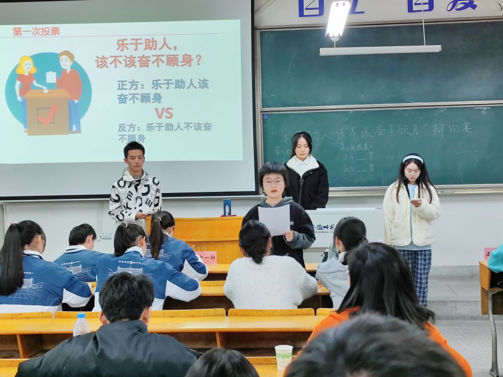 自由辩论环节将比赛气氛推向高潮,精彩不停,掌声不断。经过第二轮投票,本场辩论赛由正方获得胜利,正方辩手刘尚洁、反方辩手孙宇获得最佳辩手。辩论环节结束,赵茜表示我们需要榜样和标杆,可以将“奋不顾身”作为一种精神,指引我们乐于助人。卢皓玮认为既要“奋”也要“顾身”,我们更应该做的是学习救援知识,解决“奋不顾身”中无法保证自己安全的问题。杜安提出在危机情况下我们不应该做所谓的“看客”,助人为乐并不分大小,无论结果如何我们都需要有奋不顾身的行动。