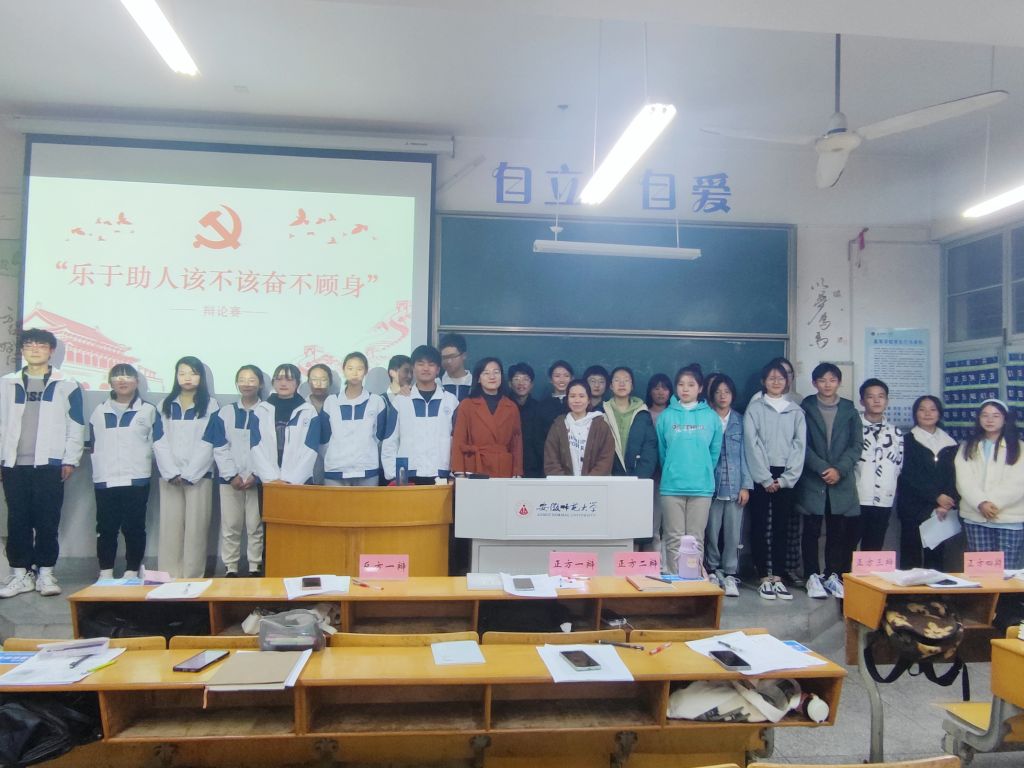 本网讯(教科院 庄灯萍)为增强当代大学生帮助他人的热情和信心,调动启蒙学子助人为乐的积极性,11月26日晚上,教科院“入党启蒙培训班“在田楼8210举行了以“乐于助人该不该奋不顾身”为题的辩论赛。参与本次辩论赛的有21级辅导员赵茜,18级学前教育专业卢皓玮、20级小学教育专业杜安,19级、20级驻班导员和先锋党员,以及21级启蒙班全体成员。