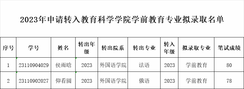 2023年普通本科生申请转入教育科学学院学前教育专业拟录取名单公示